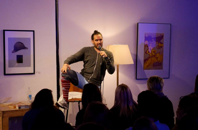 Rushing in at 7.30pm after being warned by the venue that “he doesn’t like it when people walk in late,” it was closer to 8pm when the comedian entered the small room toasty with people. Somehow looking cooler than me in his West Ham socks, sweats and draped in a blanket with his hair scraped back, Russell took a seat surrounded by his apparatus for the next hour – a bottle of water, a pile of books and a reading lamp.